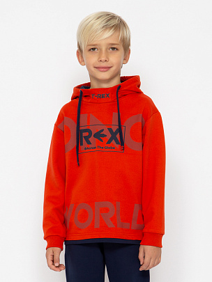 Толстовка с длинными втачными рукавами и манжетами из полотна с добавлением эластана. В нижней части толстовки расположена декоративная планка контрастного цвета. Капюшон с лицевой частью и декоративным принтом, шнурок декорирован вязаной нашивкой. Перед декорирован принтом "Панно" мир динозавров. Брюки с притачным поясом, манжетами и функциональными карманами. Пояс и манжеты выполнены из полотна с эластаном.
