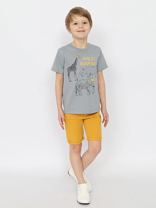 Футболка с коротким рукавом. Горловина круглая, обработана узким воротником из полотна с эластаном. Перед оформлен принтом.