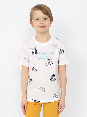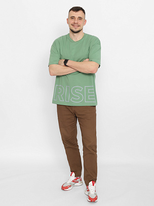 Футболка oversize со спущенным плечом, с коротким рукавом. Горловина круглая, обработана притачной бейкой из рибаны с лакрой. Плечевые швы смещены на перед и отстрочены. По переду вдоль правого бокового шва - текстовый принт.